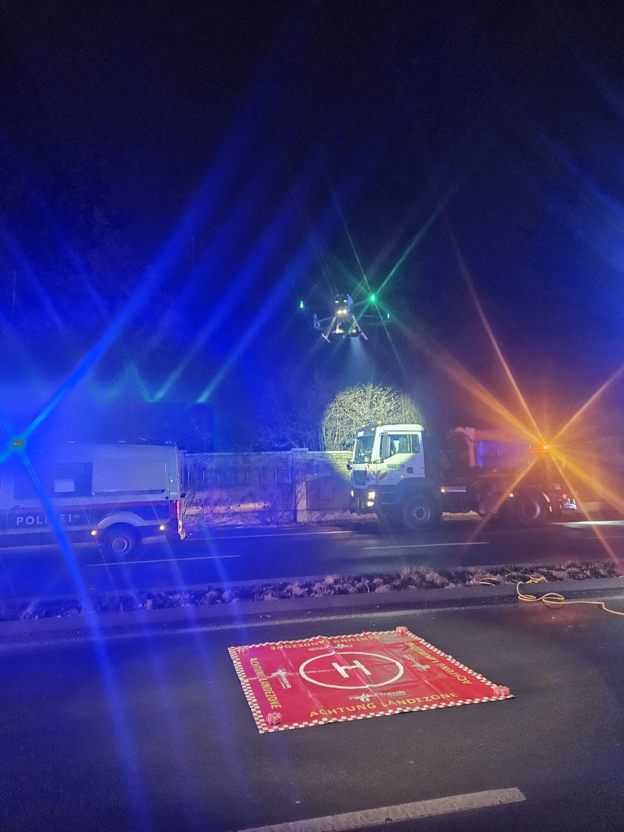 Auf Anforderung der Polizei wurde auch die Drohne der Feuerwehr zur Einsatzstelle beordert. Die Luftaufnahmen werden das Unfallkommando bei der Ermittlung des Unfallherganges unterstützen.
