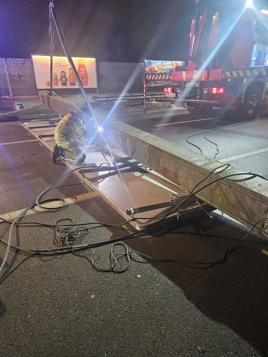 Durch den Aufprall des Fahrzeuges wurde der Überkopfwegweiser gänzlich aus den Verankerungen gerissen und ist dieser auf die Fahrbahn gestürzt. Glücklicherweise war zu diesem Zeitpunkt kein Verkehr Richtung stadteinwärts unterwegs.